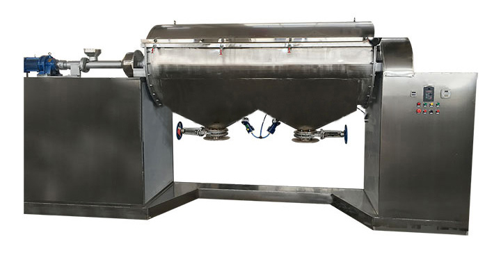 2、依靠安裝在筒體內(nèi)壁交錯(cuò)排列的混合螺旋葉片,提供一種獨(dú)特的分裂和結(jié)合運(yùn)動(dòng),使物料在較短的滯留時(shí)間內(nèi)在筒體內(nèi)前后投擲翻轉(zhuǎn),從而產(chǎn)生物料的回流混合。這種螺旋葉片確保了拌料機(jī)的混合運(yùn)動(dòng)是溫和的,不會(huì)產(chǎn)生對(duì)物料的破碎。
